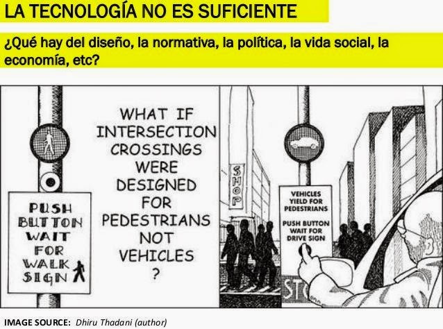 1. La tecnología no es suficiente, o la necesidad de integrar elementos no tecnológicos mucho más decisivos a la hora de diseñar nuestras ciudades. De manera, por usar el ejemplo de la ilustración que el primer objeto inteligente implantado en las ciudades –el semáforo- ha sido mucho más decisivo por las decisiones de diseño –la opción de dar la prioridad al tráfico rodado y no a los peatones- que por sus partes mecánicas o electrónicas.
